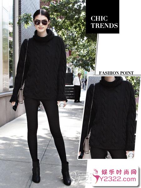 【搭配示范】:黑色毛衣+黑色打底裤+黑色短靴