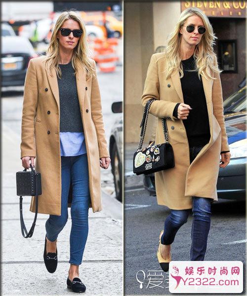 妮基·希尔顿(Nicholai Olivia Hilton)可是非常钟爱这件卡其色羊绒大衣,两次出门纷纷都穿上了它,左边的叠穿休闲造型和右边的优雅气质的造型都很好看!