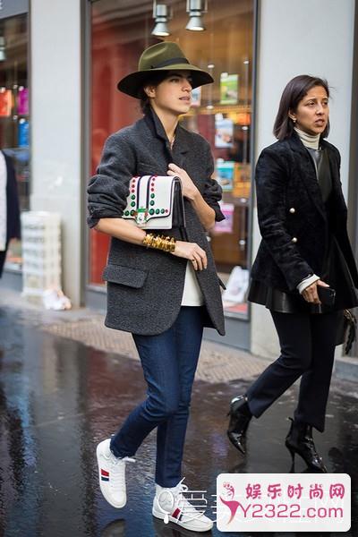 另外一个西装look也是,如果只是灰西装+牛仔裤+白球鞋,估计会很无聊,没个性,但是 Leandra Medine却能用几个手镯+彩色包包+帽子完成时髦look!