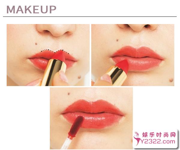STEP5 将唇山描出来; STEP6 直接在嘴唇上涂上唇膏; STEP7 涂上唇油就完成了!