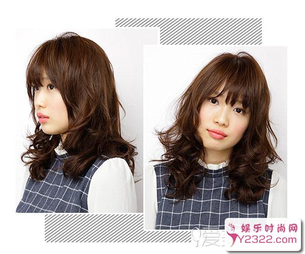 卷曲的红棕色卷发,配上薄薄的空气刘海,给人浪漫甜美的感觉,同时脸颊两旁的卷发与使额头若隐若现的刘海搭配能有效缩小脸型哦。
