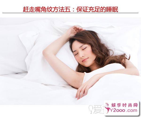 赶走嘴角纹方法五:保证充足的睡眠。保证充足的睡眠和良好的新陈代谢。经常熬夜或睡眠不足,会使皮肤在夜间无法得到正常的休息和养分供给,很容易在嘴角形成弹性下降、松弛及早衰现象。